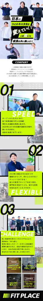 株式会社FIT PLACEが運営する本格24Hフィットネスジム『FIT PLACE24』のキャリア採用を約半年間ご支援。設立から3年でグループ売上150億円超えと急成長を遂げる企業に欠かせない人材採用課題を解決。